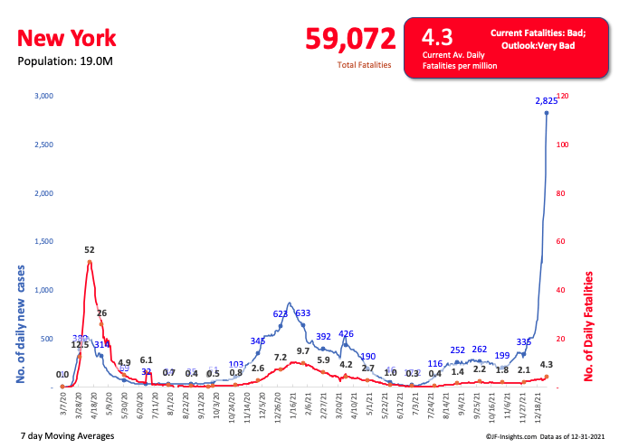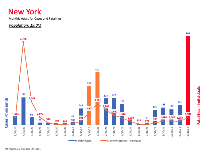 Lets review NY as one example. Here the unprecedented impact of the Omicron wave is very evident. NY did better in 2021 than in 2020. It recorded 21,000 deaths this year – compared to 37,000 in the prior year.