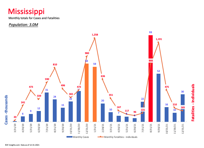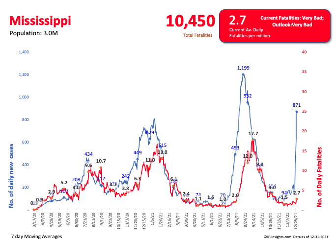 The state with the highest overall number of fatalities per capita is Mississippi with 3,500 fatalities per million. Here’s how that state was impacted by COVID. Just over 10,000 fatalities on a population of 3 million.