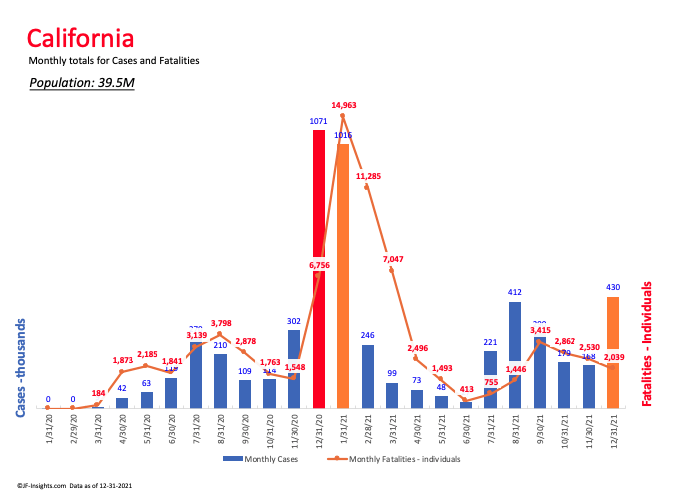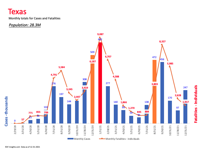 Texas is the second most populus state – with over 29 million residents. Its total fatalities per capita are 2,687 – or basically 39% higher than CA. Basically Texas got hit much more severely with the Delta wave. September 2021 came very close to the record number of deaths in January 2021.