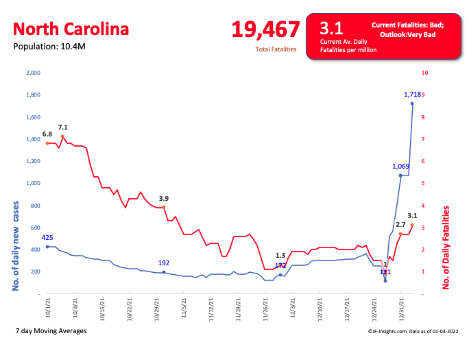 Lets look at this in whole numbers (not per capita) at the US levels. Average daily new cases are over 400,000 per day – and average daily fatalities are 1,360.