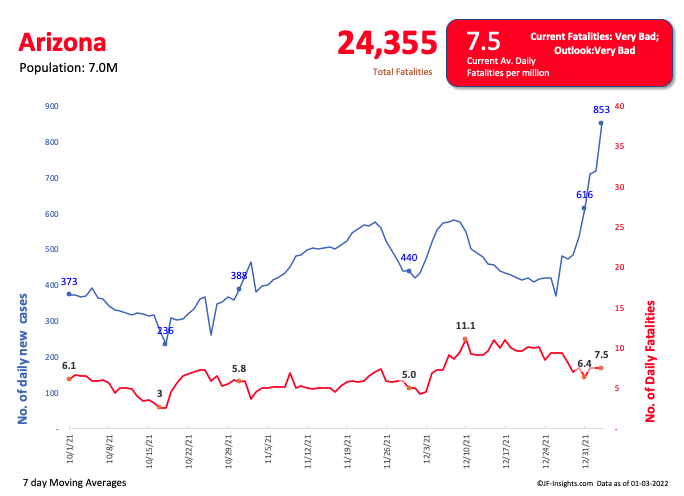 Arizona has one of the highest levels of total covid fatalities since inception in the country. At #2 on the list it has had over 3,400 deaths from COVID per million residents since inception.