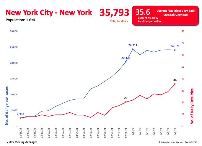 Here’s the graphical trend – per capita at the state level. Notice the rate of fatalities has tripled in the past 3 weeks. While Omicron may be less severe in percentage terms; the sheer spread of Omicron can still result in large numbers of fatalities.