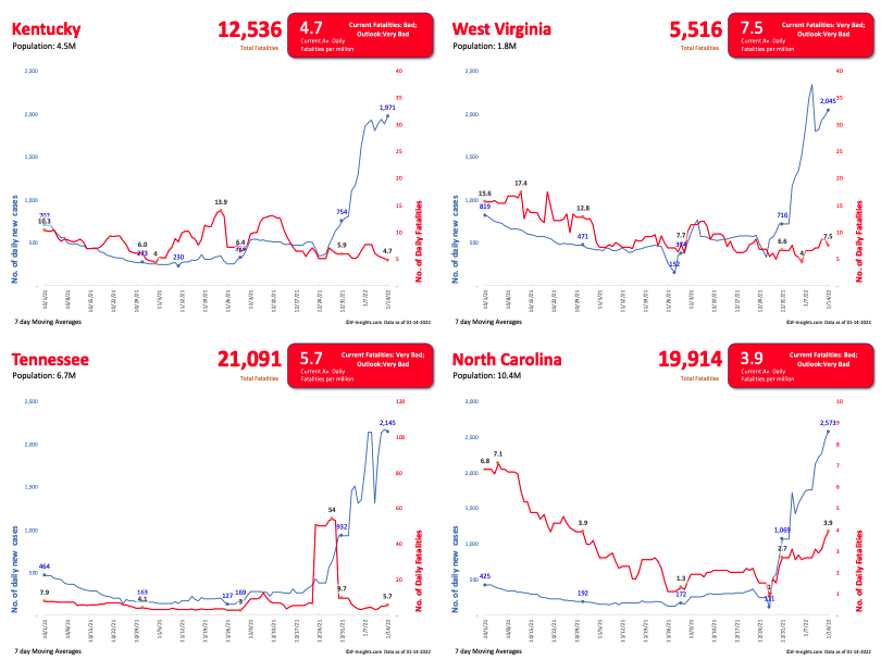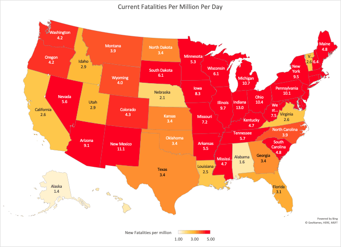 And many states are at high levels of per capita fatalities. Indiana is currently leading the country with 13 fatalities per million per day.