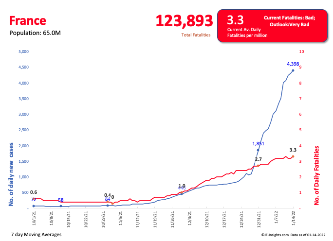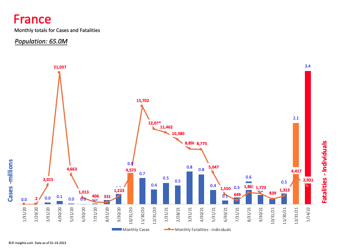 France is the #2 country in the world for new cases – around 4,000 cases per million per day. That’s almost double the rate of case creation as the US. Over 3 million cases recorded this month to date. Fatalities this month will likely be the highest for the past 8 months.