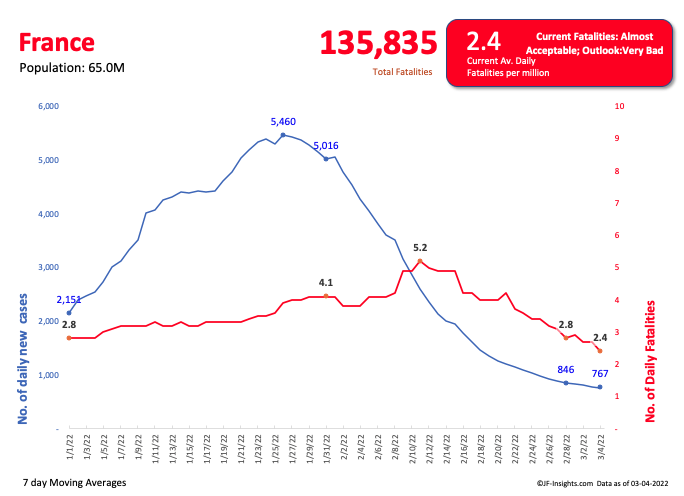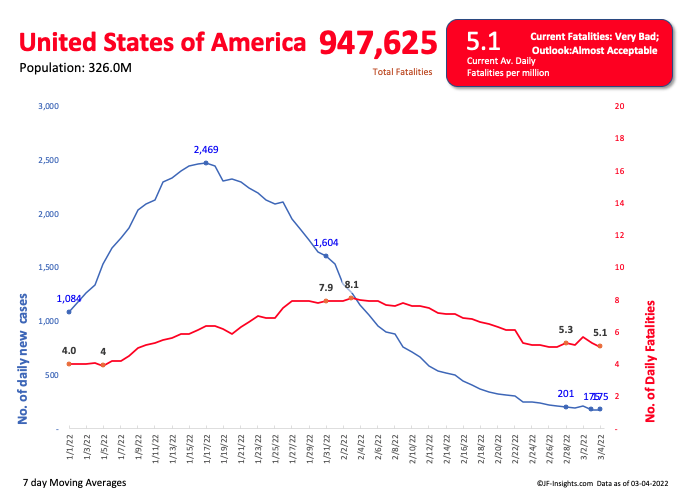 While most of the west has peaked regarding Omicron and is now starting to see fatalities fall – the Russian picture isn’t as rosy. Official numbers (source WHO) show cases have peaked – but fatalities are still relatively high at 5.3 per million per day.