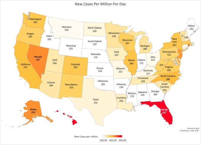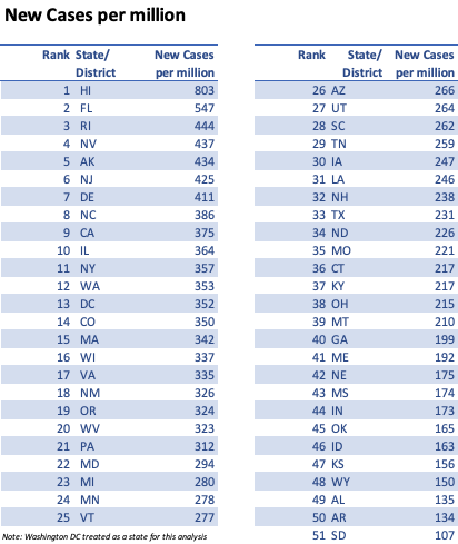 Here’s the US map using count of new cases per million. Hawaii, Florida, Rhode Island, Nevada and Alaska lead the statistics: