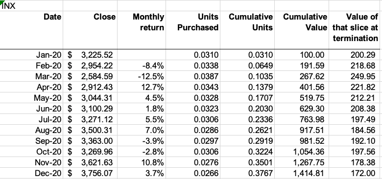 Here’s how it works: $100 invested at the end of Jan 2020 – would be worth $200 today. That slice of your investment has been in the market for 67 periods. $100 invested at the end of February would be worth $218 today. Alhough that investment has been in the market for only 66 periods, the February investment bought more shares because the market fell in Jan, Feb, and March 2020. Here’ a sample of the analysis.
