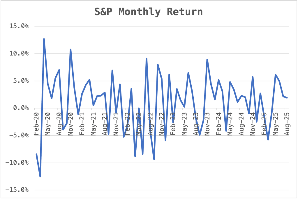 Another way to look at those numbers is to look at them in buckets. Of the 68 periods between Jan 2020 and August 2025 there were 8 that were strongly negative (more than 5% loss), and 16 that were slightly negative (between 0 and -5%). That’s a total of 24 down months, compared to 43 up months.