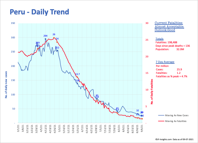 Some good news for Peru Peru leads the world in reported deaths per capita. As you can see from the table below – almost 2x the number of the second country in the table. Thats a total of almost 200,000 deaths on a population of 32 million people Improving trend Current fatalities are now justContinueContinue reading “Peru – the worst impacted country in the world for COVID – shows sustained improvement”